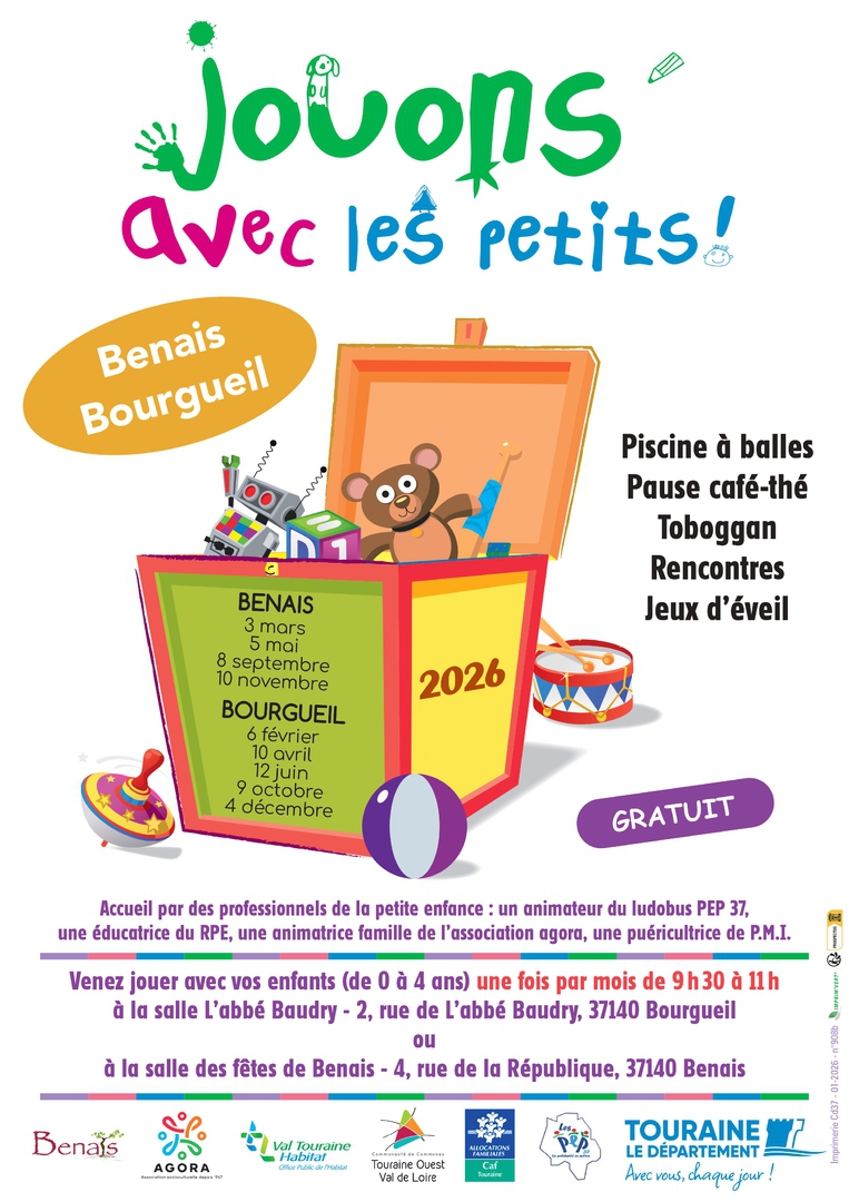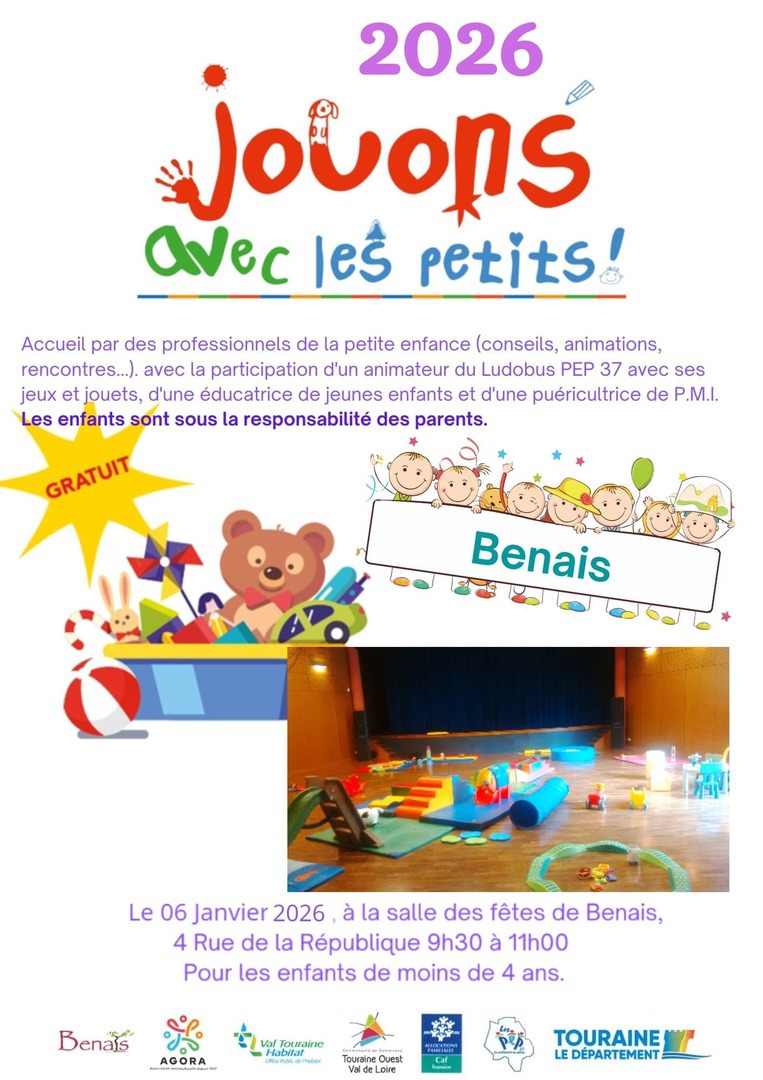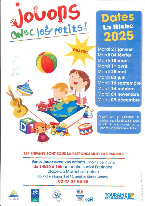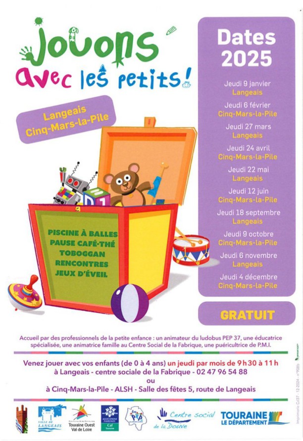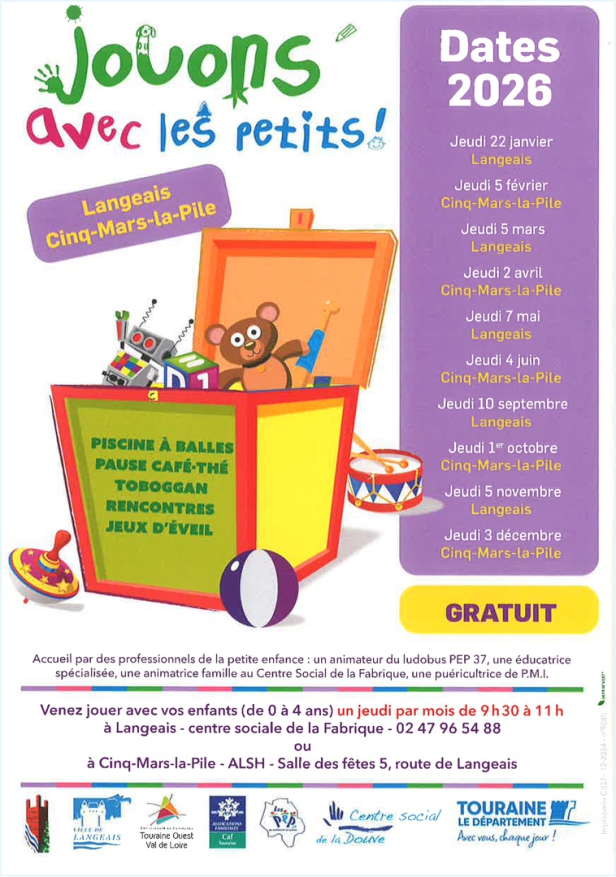 “Jouons avec les petits” propose un espace de jeu libre convivial à destination des enfants de moins de 4 ans avec leurs parents ou un autre adulte familier (grands-parents, proches…).Ce lieu de rencontre favorise l’échange et les interactions en toute liberté.